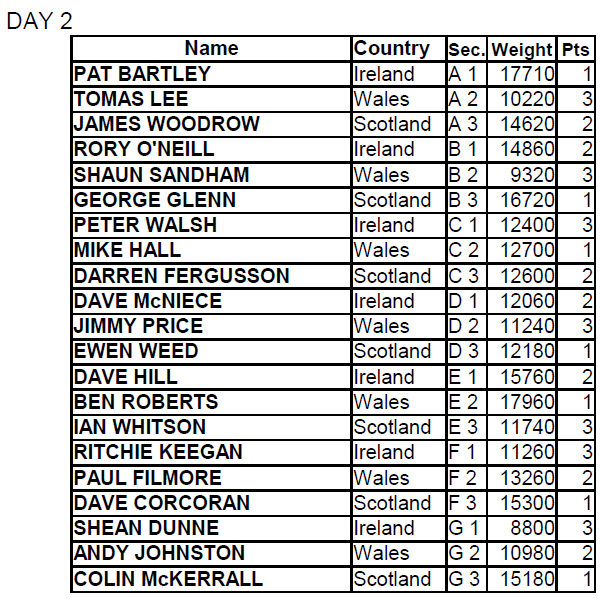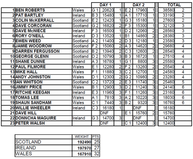 Scottish International Manager said, “After regaining the Cup at home last year we were determined to do our best to keep it. We knew however that it was going to be a challenge with both Ireland and Wales fielding strong teams and Ireland having the all important home advantage and knowledge of the venue. The Celtic Cup whilst fiercely competitive over the two days of competition is however extremely important as a development ground and our squad contained two new caps in Darrin Fergusson and Colin McKerrell, both of whom fished exceptionally well with Colin ending up as Top Jock with section wins on both days. The fishing was incredible with the 21 competitors banking 284 kg and 580g of fish on day one and 276 kg and 810g on day two, an average of over 13kg per angler per day. The Irish Federation, and particularly their manager Dick Caplice, must be congratulated for running an outstanding event which involved an enormous amount of effort to prepare the venue, and for the excellent hospitality we received everywhere we went in and around Castleblaney. This emphatic win is just what the squad needed and sets us up well for the forthcoming trip to Holland for the World Championship in Almere later this month and I am confident that if we fish as well there we will get a good result.”