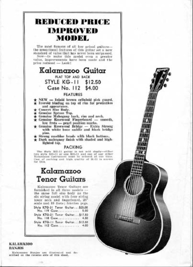 ‘This is the 1930s equivalent of a budget guitar. Not bad for a cheapo eh? Back in those days, Gibson were building guitars to such a high standard that the depression suffering public could not always afford the premiums charged. So the bods in Kalamazoo bashed their heads together and came up with a plan to make a budget range of guitars with a different branding. The Kalamazoo brand was born. This little beauty, the KG-11, is a lovely example of the type of quality we’re talking about here. It’s not even that far off the Gibson L-0 that it’s based on. It has a tone that has often been described as boxy, certainly bluesy, reminiscent of those 30s blues legends and the guitar tone they produced. There are a few knocks and dinks, but then how many things that are nearly 80 years old do you know that aren’t?’