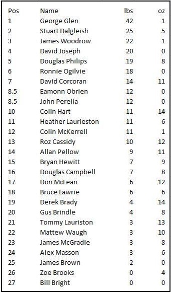 Overall top 5 … 1st – George Glen 42lb 1oz, 2nd – Stuart Dalgleish 25lb 5oz, 3rd – James Woodrow 22lb 1oz, 4th – David Joseph 20lb 0oz, 5th – Douglas Philips 19lb 8oz