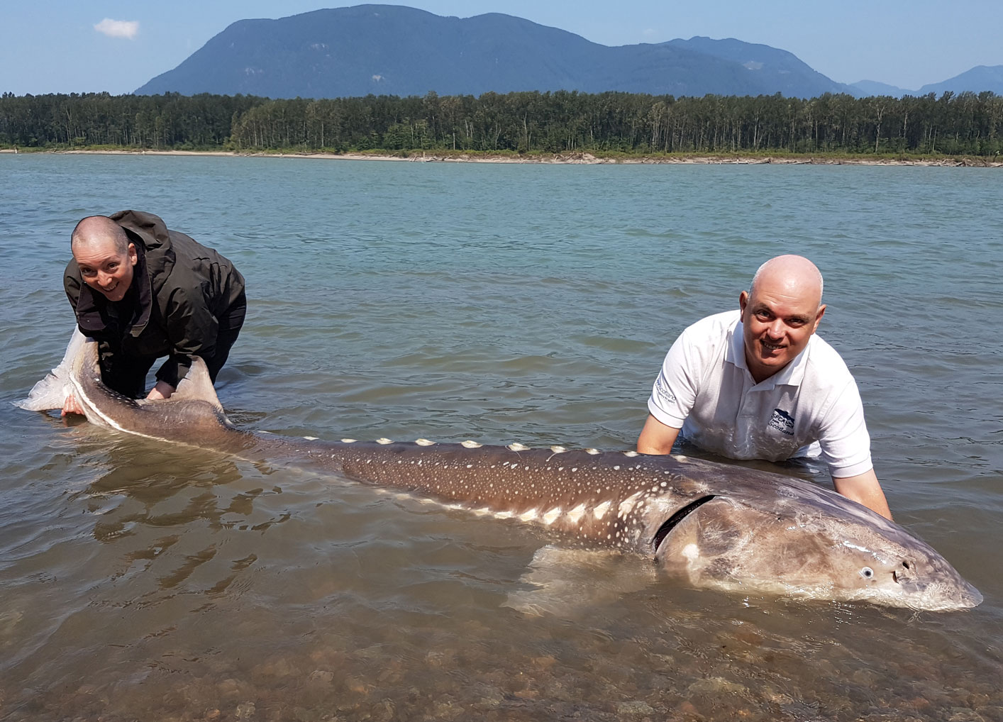 After what seemed like an age, we made it to shore where we could properly admire this incredible creature in the shallow water. I held Matt’s tape measure on its nose and he ran it down to its tail. ’10ft 2in’ he whooped, ‘could be biggest of the year so far’. I was astonished and delighted, but mainly made up for Matt … his expertise led to this and would be a major feather in his cap and for Lang’s. This length of Sturgeon is estimated to weigh around 570lb!
