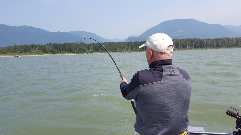 What an impressive place to be, anchored in the middle of such a powerful river in the most stunning scenery. We didn’t catch in that first spot, so he moved the boat downstream to another deep hole. The Fraser River is so big and fast the 3 rods he set up for us needed a 24oz lead, along with 200lb braided line and hooks up to 10/0 loaded with Salmon pieces as bait.